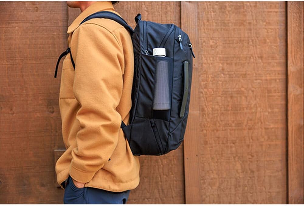 - Side stretch mesh water bottle pocket