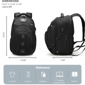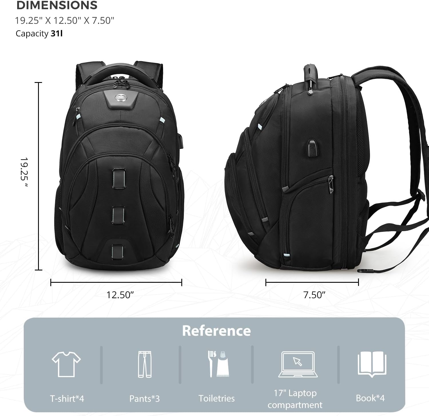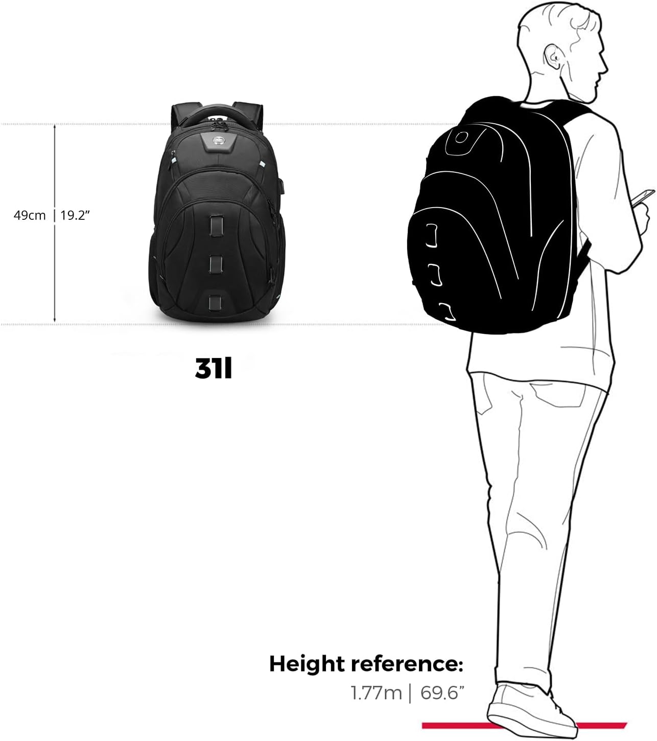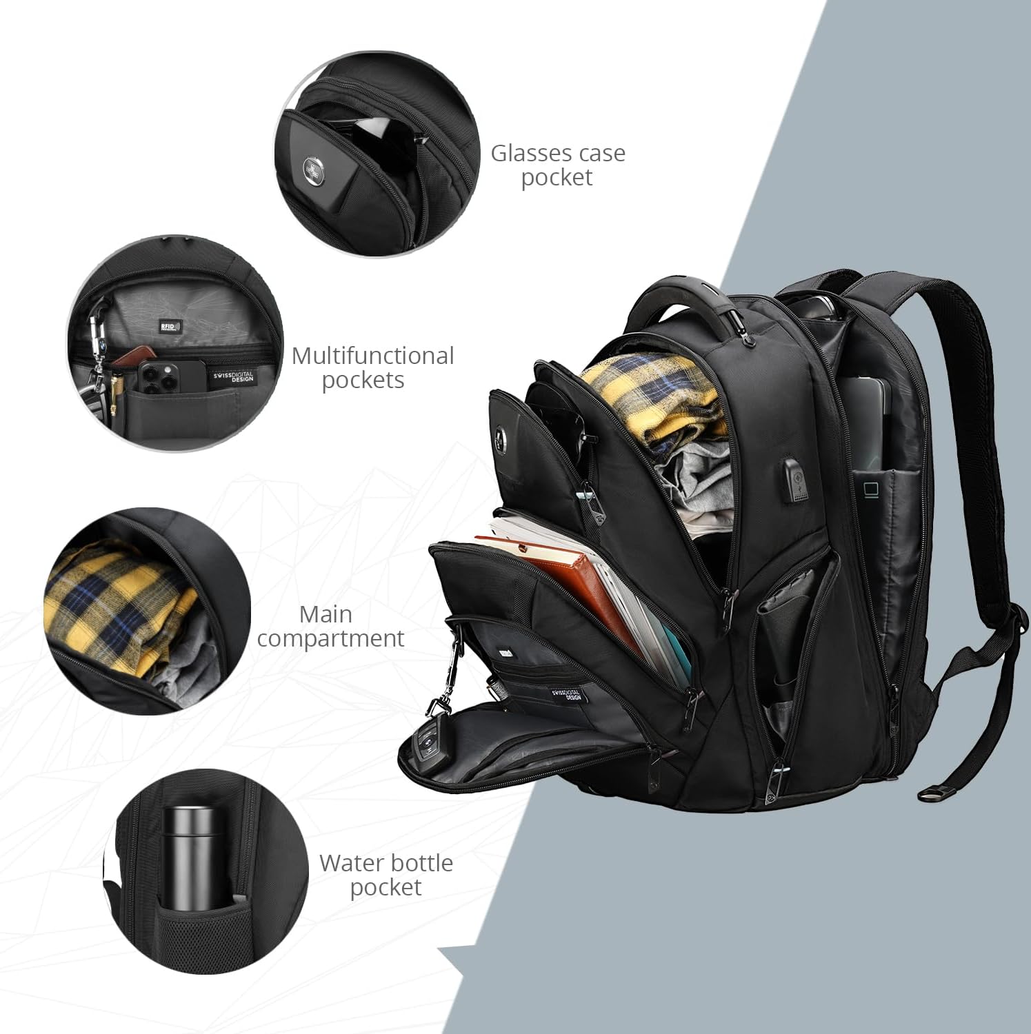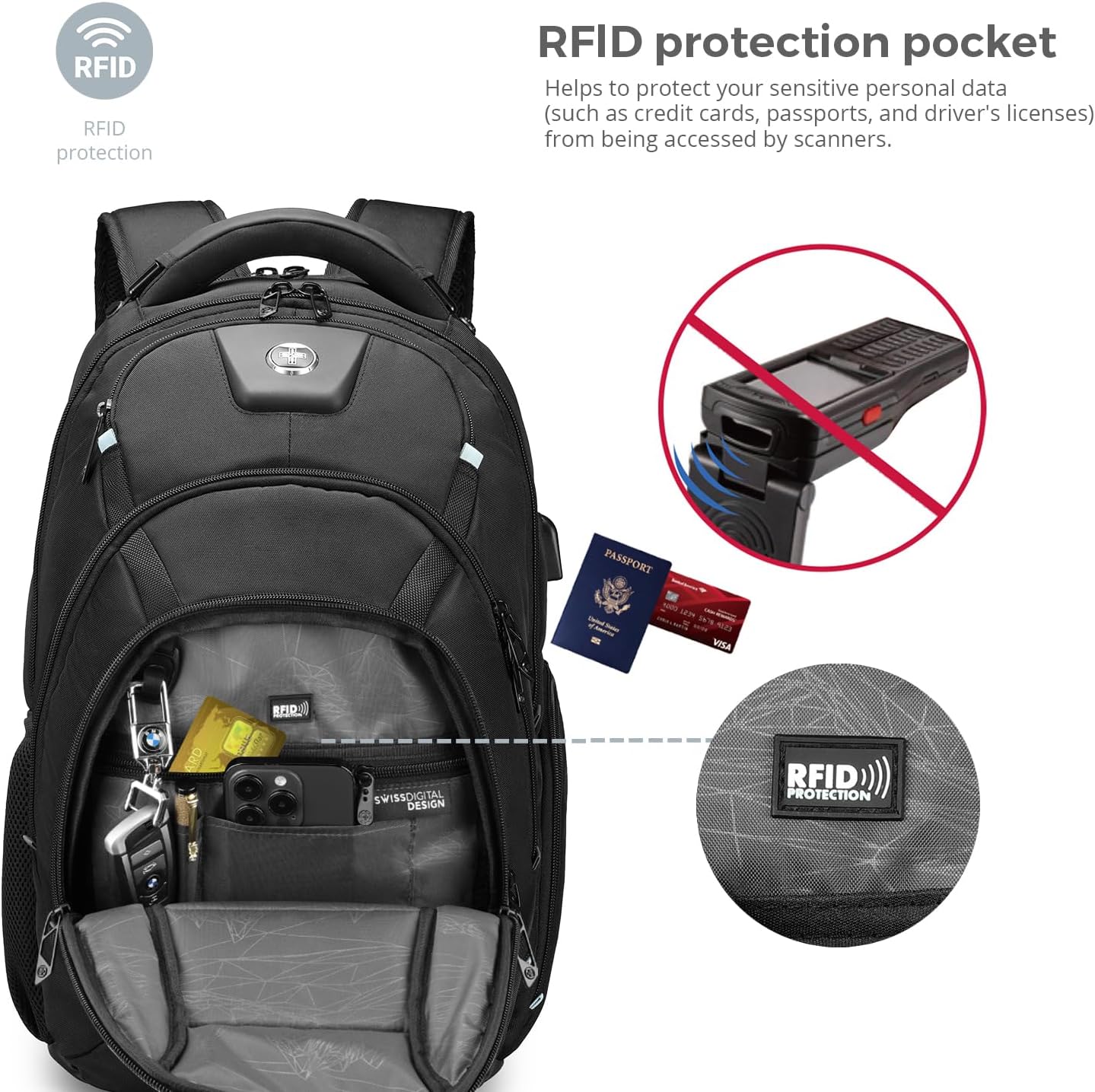 Swissdigital Design Men’s Travel Laptop Backpack, Large Capacity TSA Friendly USB Charging RFID Protection Backpack for College and Business, Fits 17″ Laptops Black | PIXEL PRO