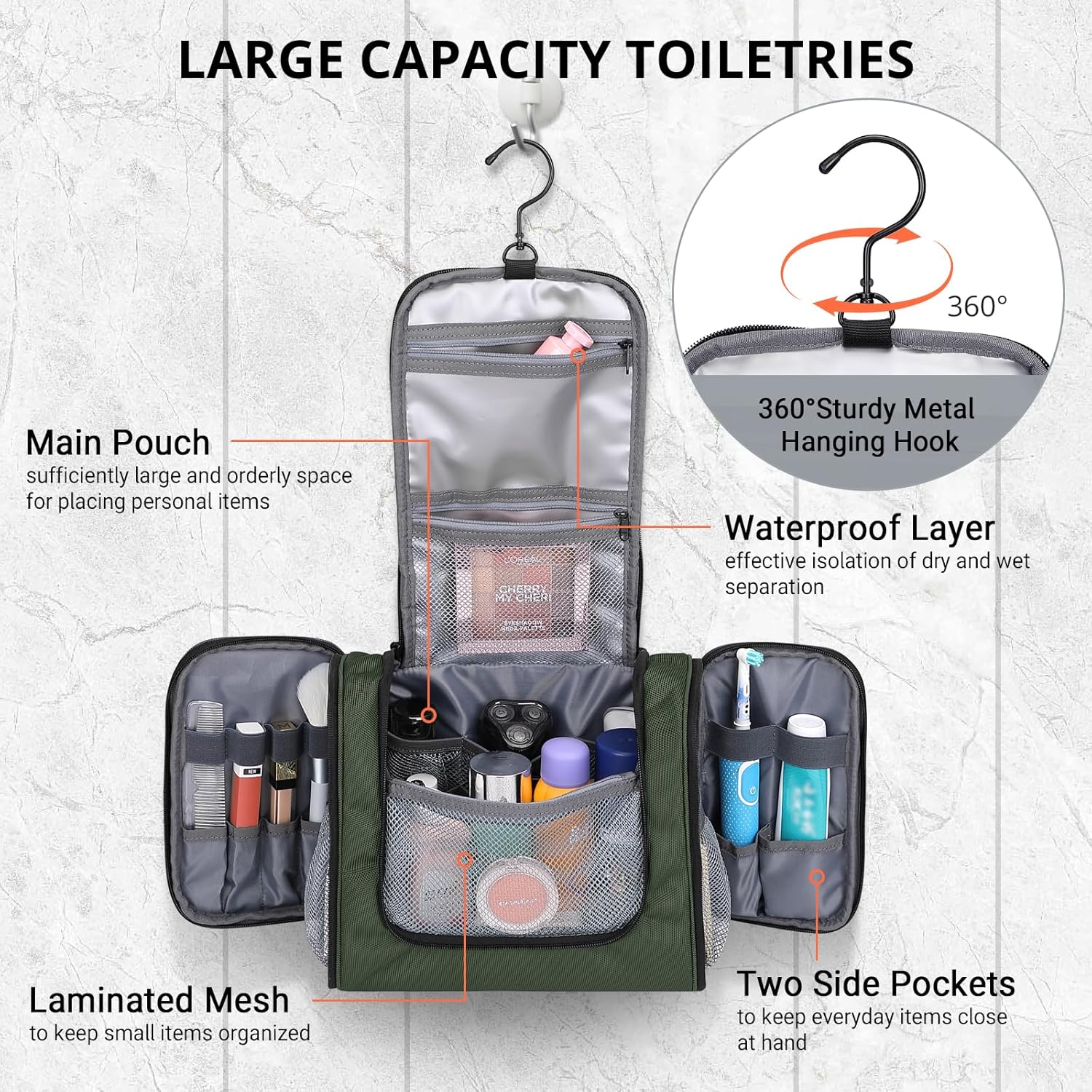 - Travel Toiletry Organizer Has 19 Compartments:Main compartment U-shaped opening, including 2 laminated mesh zipper pockets, a waterproof zipper pocket, and many laminated meshes; There are also many compartments inside the two side zipper pockets.There is also a zipper pocket on the back.There is enough space here to store toiletries for long-distance travel or family vacations, such as shampoo, toothpaste, toothbrushes, towels, shaving accessories, etc.
